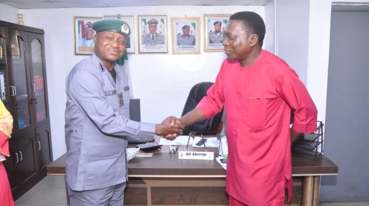 Comptroller Samuel Ariyibi,l(eft)in a handshake with MAJAN president,Mr Jerry Aguigbo, during the Association’s visit to the command on Friday, November,28 2025