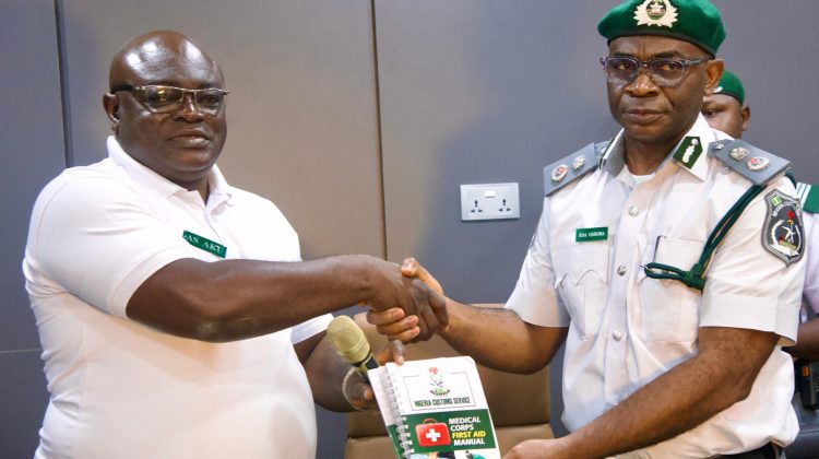 L-R Medical Team Lead and Zonal Medical Officer for Zone B, Comptroller A.S Aku, presenting first Aid manual to Apapa CAC, Comptroller Emmanuel Oshoba,at the Apapa command recently