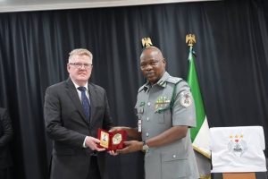 R -L CGC) Bashir Adewale Adeniyi MFR,presenting a souvenir to project manager of West Africa Security Project (WASP) Terry Wall, during a meeting at NCS Headquarters,Abuja,on Tuesday,13th February,2024