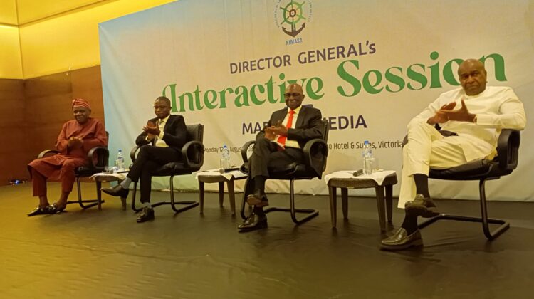 3rd from left,Director General NIMASA,Dr Dayo Mobereola,flanked on his left , Executive Director Finance and Administration,Chudi Offodile,1st from left Executive Director Operations ,Engr.Fatai Taiye Adeyemi,and Executive Director Maritime Labour,Jubilee Abbah,at the interactive session with Maritime Media,on Monday, August 12, 2024, at Eko Hotel,Lagos